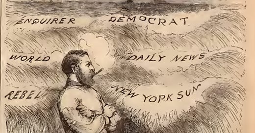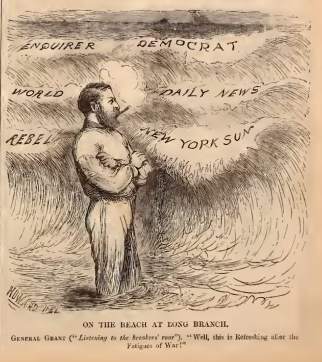 Since most of this part will be covered in the book, it is worth noting that the opposition to Grant was already baked into the cake of his tenure in office. The major NYC newspapers (which prided themselves on being the elite ruling chattering classes) drove the narrative hard. Grant = bad; anyone who agrees with us = good. The papers in the cartoon represent the South, and NYC Democrat and “Republican” papers. They were all on the same page loathing Grant. There were a few exceptions. The New York Times was generally positive and friendly to Grant.